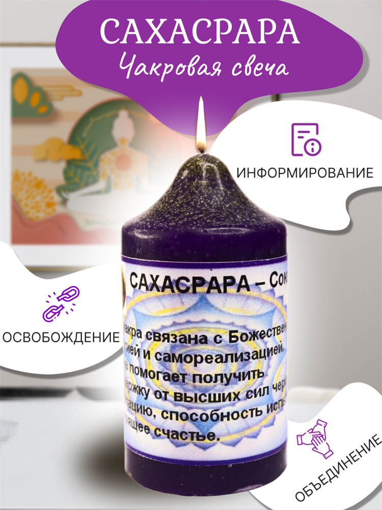 Эта чакра связана с Божественной энергией и самореализацией. Свеча помогает получить поддержку от высших сил через медитацию, способность испытать настоящее счастье.