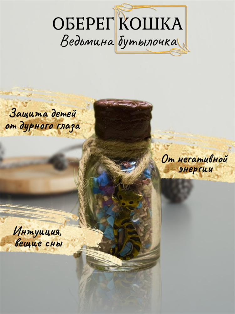 Ведьмина бутылочка, древний магический предмет в истории колдовства. Назначение может быть различным, в зависимости от наполнения, способа изготовления и цели. Данный вариант служит как талисман-оберег. Каждая бутылочка содержит символ, камень, соль и травы тщательно подобранные для каждого варианта, закупорена сургучом и опечатана магической печатью.